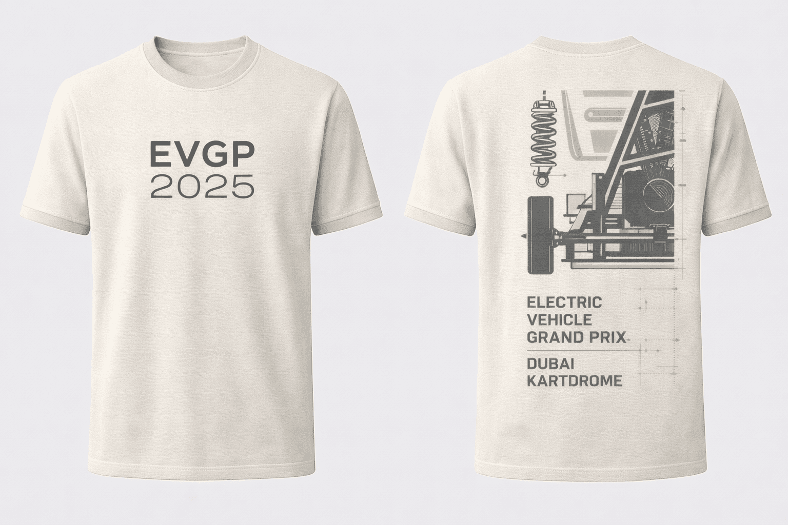 The official event T-shirt of the UAE EVGP. Featuring the EVGP logo on the front and the race circuit, event date, and participating team names on the back, this piece serves as a permanent record of the competition. Designed as event memorabilia rather than casual merch, it captures the moment teams took part on the track. Available in black, white, and grey.